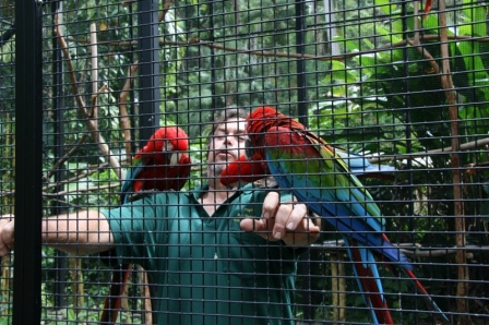 Wunderschöne und lustig verspielte Papageien in einem großen Fluggehege. „Das Herrchen“