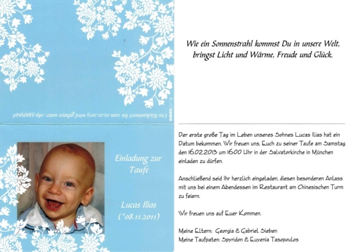 Lucas Taufe am Samstag, den 16.02.2013 um 16:00 Uhr in der Salvatorkirche in München mit anschließendem Abendessen im Restaurant am Chinesischen Turm.