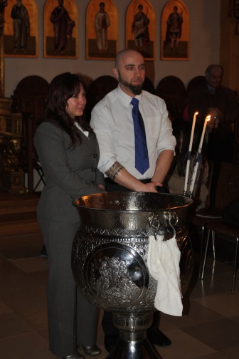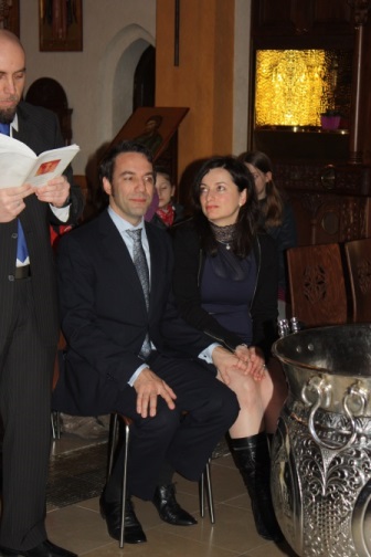 Wir Eltern warten, während die Beiden Taufpaten das Glaubensbekenntnis auf griechisch und englisch beten. |