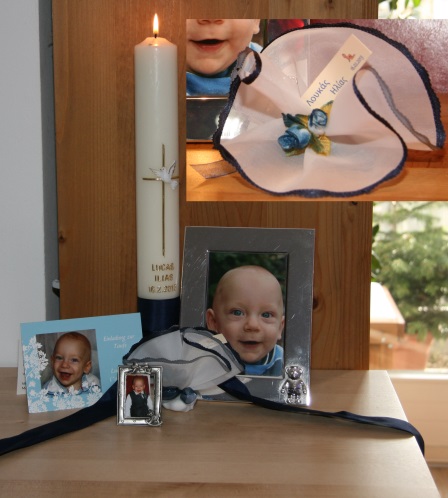 Lucas Taufkerze mit den beiden Namen, Taufdatum und Dekoschleife vom Wachszieher am Dom Die aufstellbare Taufeinladung, sowie die Beiden Gastgeschenke: