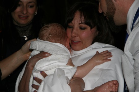 Segnung und Ende der Taufe. Die Eltern, die Paten, der Täufling, der Pater und Sara mit der Taufkerze stehen am Taufbecken. Sara ist unsere Nichte, Lucas Cousine und mein Patenkind. |