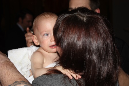 | Lucas streckt und reckt sich, während Pater Petros spricht. Er schafft es sich so lang zu machen dass er mit einem großen Zeh das Wasser berührt. Das Drumherum dauert ihm wohl zu lange und so fängt er zum Schreien an. Verständlich aus seiner Sicht - wieso wird er denn auch über das Wasser gehalten und nicht einfach reingesetzt... Jetzt wird er auch noch eingeölt - "jetzt ist aber dann mal gut..." | ![]() |