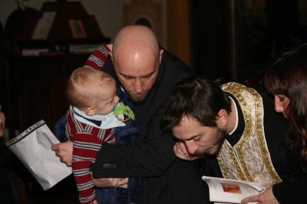 Nach der Taufe verbeugt sich die Mutter (ich) vor der Ikone Christi, küsst sie und macht eine Verbeugung vor dem/r Taufpaten/in und küsst die Hand. Danach wird ihr das Kind übergeben. Lucas wird dann eingekleidet. |