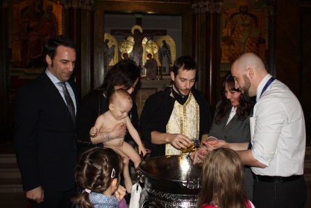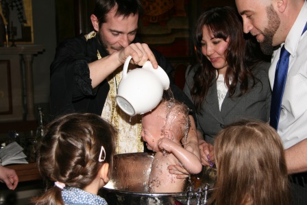 Das Glaubensbekenntnis wird von den Paten im Namen des Babys gebetet. Der Priester segnet das Wasser des Taufbeckens und gießt den Paten das Olivenöl über dem Becken in die Hände. Das Baby ist unbekleidet und wird von den Paten mit dem Öl von Kopf bis Fuß eingerieben mitten ins Wasser gesetzt und mit Wasser übergossen. Dann sagt der Priester drei Mal "Der Diener Gottes, (der Name des Babys), wird getauft auf den Namen des Vaters und des Sohnes und des Heiligen Geistes."