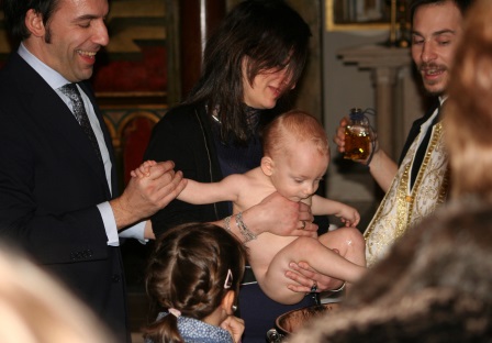 Die Taufpaten bekommen über dem Taufbecken Olivenöl in ihre Hände. Damit wird Lucas gleich von Kopf bis Fuß eingerieben. Lucas liebt es zu Baden, daher wartet er schon ganz ungeduldig auf sein Bad... |